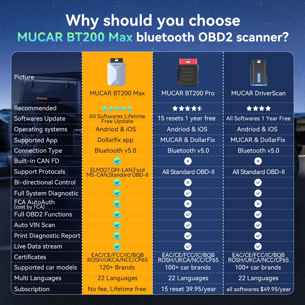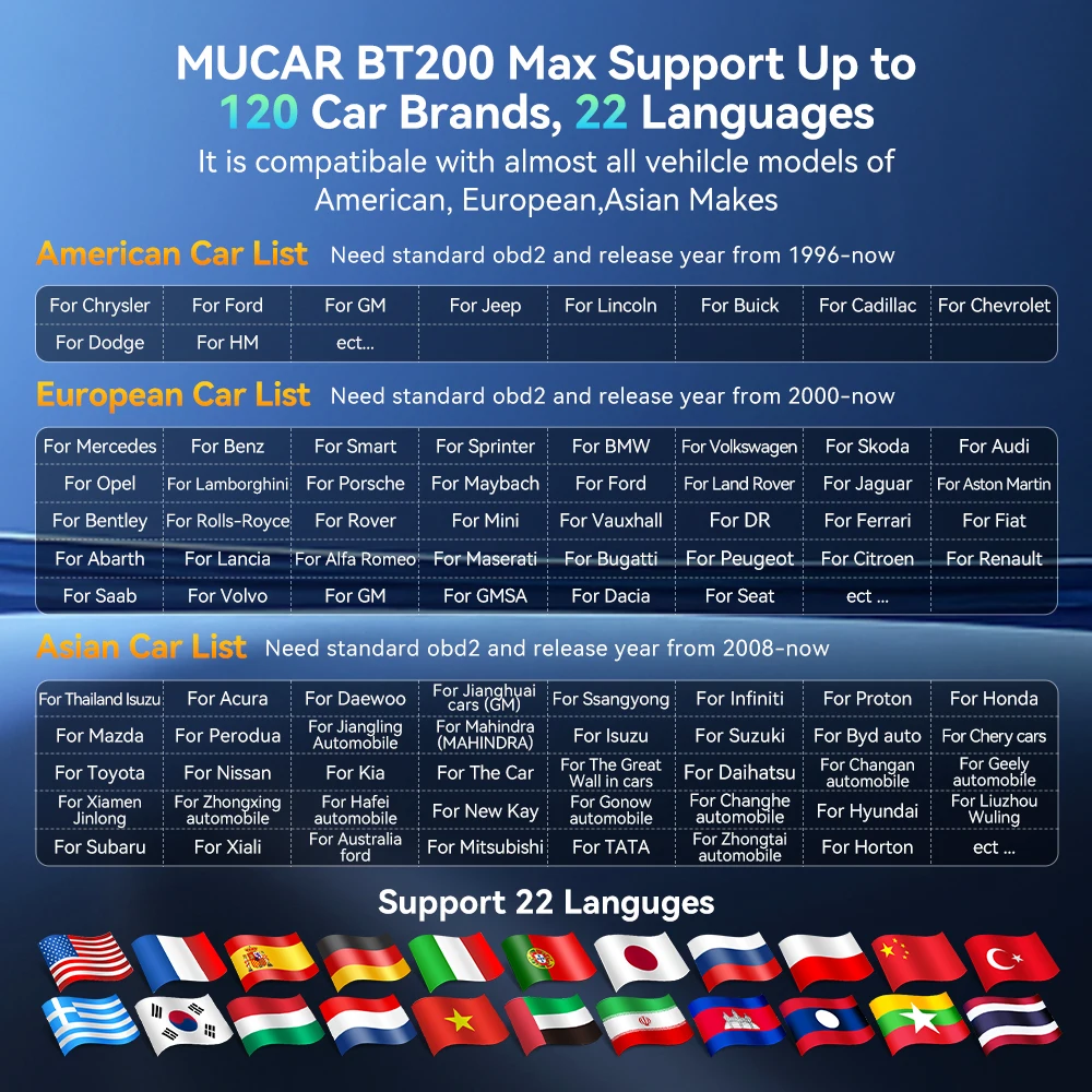 MUCAR BT200 Max Support Up to 120 Car Brands, 22 Languages