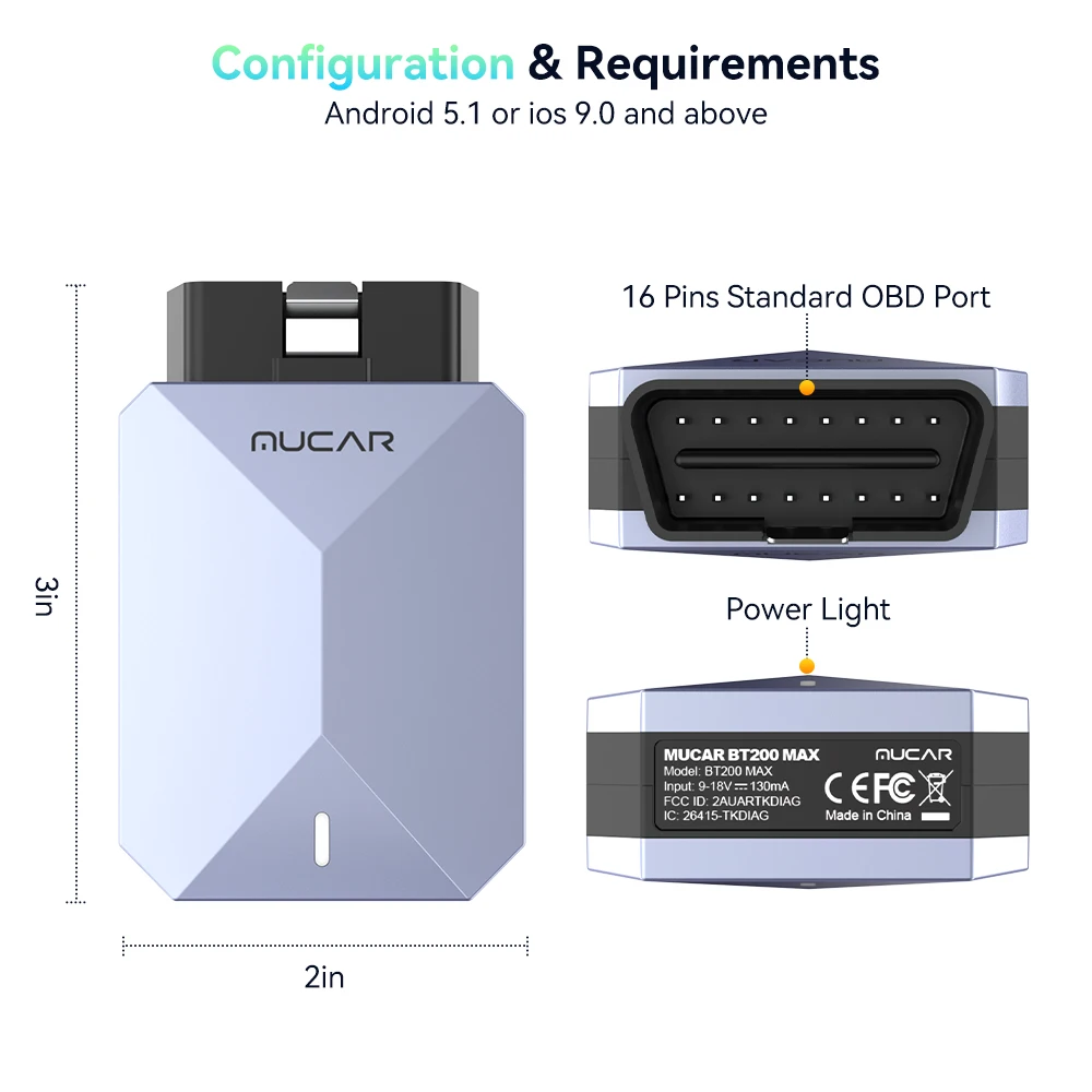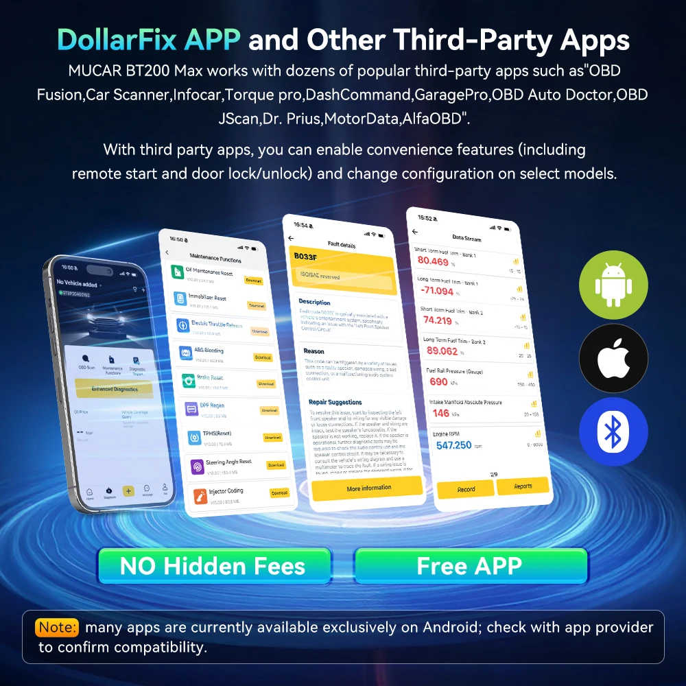 MUCAR BT200 Max Fungerar med dussintals populära tredjepartsappar som ”OBD Fusion, Car Scanner, Infocar, Torque Pro, DashCommand, GaragePro, OBD Auto Doctor, OBD JScan, Dr. Prius, MotorData, AlfaOBD”. Med tredjepartsappar kan du aktivera bekvämlighetsfunktioner (inklusive fjärrstart och dörrlåsning/upplåsning) och ändra konfigurationen på utvalda modeller.