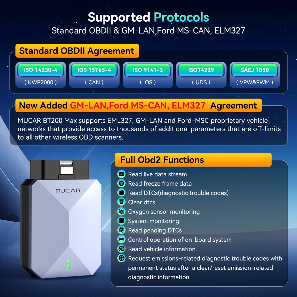 MUCAR BT200 Max supports EML327, GM-LAN och Ford-MSC, egenutvecklade fordons nätverk som ger tillgång till tusentals ytterligare parametrar som är oåtkomliga för alla andra trådlösa OBD-skannrar.